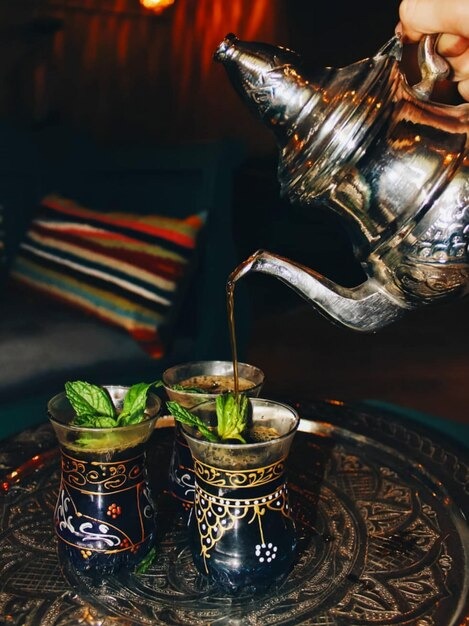 Traditional green tea infused with fresh mint leaves and sugar, served hot in authentic Moroccan style.