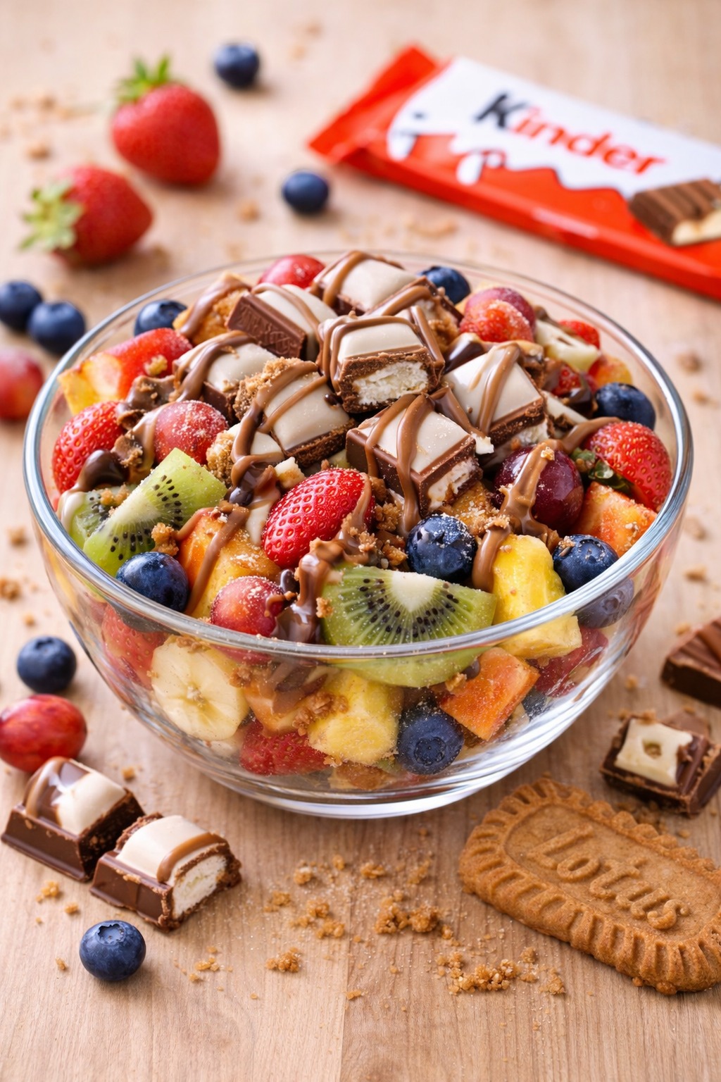 A delicious fruit mix topped with creamy Kinder chocolate