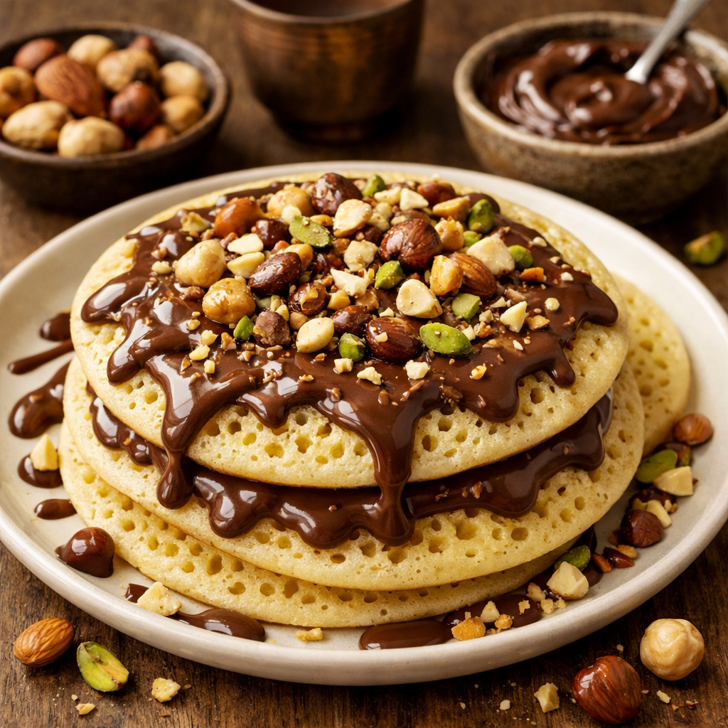 Moroccan spongy pancakes served with chocolate and nuts
